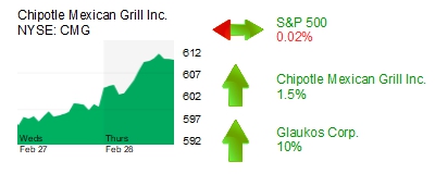 Chipotle Mexican Grill Inc. (NYSE: CMG) was up 1.5% to $608.16 for a $16.8 billion market cap. Shares of the Newport Beach fast casual restaurant chain have increased 15% since it reported fourth quarter earnings on Feb. 6.