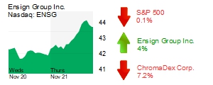 San Juan Capistrano-based Ensign Group Inc. (Nasdaq: ENSG) rose 4% to $42.69 and a $2.3 billion market cap. The skilled nursing and assisted living facilities operator’s shares are up about 8% on the year.