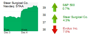 Staar Surgical Co. (Nasdaq: STAA) in Lake Forest rose 4.3% to $38.42 and a $1.7 billion market cap. Analysts at BTIG initiated coverage on shares in the maker of implantable lenses for eye care with a buy rating and $46 price target. Canaccord Genuity and Benchmark last month maintained buy ratings with price targets of $45 and $50. A mention of Staar today on a stock watching website cited its low debt—$43 million due over 12 months or more—compared with cash and receivables of $145 million, and earnings that have more than doubled in the last year.