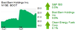 Irvine Western-inspired retailer Boot Barn Holdings Inc. (NYSE: BOOT) jumped 9.9% to $22.34 and a $644 million market cap. The company yesterday reported net sales of $147.8 million for the quarter ended June 27, topping the consensus estimate of $137.5 million. Boot Barn recorded a loss of about $500,000, which came in better than analyst consensus estimate of a $4.3 million loss for the quarter.