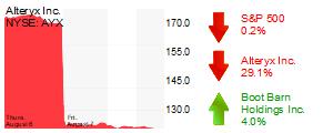 Shares of Alteryx Inc. (NYSE: AYX) sank 29% to $119.82, a day after the Irvine data analytics software maker warned of “significant headwinds” to the company’s business in the coming quarters. Alteryx had a recent market cap of $7.9 billion.