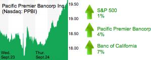 Irvine-based Pacific Premier Bancorp Inc. (Nasdaq: PPBI) climbed 4% to $19.42 with a $1.8 billion market cap. Santa Ana-based Banc of California Inc. (NYSE: BANC) increased 7.2% to $9.08 a share with a $491 million market cap. First Foundation Inc. (Nasdaq: FFWM) in Irvine rose 4% to $12.90 a share with a $576 market cap.