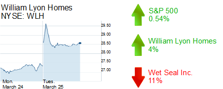 Newport Beach-based William Lyon Homes rose about 4% to $28.45 for a market value of $886.56 million.
