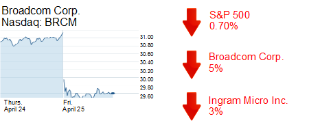 Irvine chipmaker Broadcom Corp. was off about 5% to $29.61 for a market value of $17.20 billion.