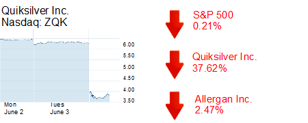 OC apparel stocks are being hammered today, led by Quiksilver, down 37.62% to $3.62. After close of business yesterday, the Huntington Beach-based company reported a loss of $46 million for the quarter ended April 30. Analysts had expected a loss of $3.4 million. Pac Sun was down 5.91% to $2.23; Tilly’s was down 2.43% to $8.23; and Wet Seal was down 1.93% to $0.87. All of the companies reported poor numbers in the past week, and saw their stocks drop between 10% and 35% since then.