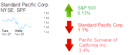 Irvine-based Standard Pacific Corp. was down 1.1% to $7.47 and a market cap of $2.1 billion, a second day of slight declines after a Bank of America analyst downgraded shares from “buy” to “neutral.” The stock is down about 2% this week.