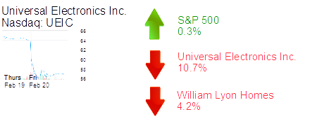 Newport Beach-based William Lyon Homes was down 4.2% to $21.67 and a $677 million market cap. The builder said fourth quarter earnings declined 21% to 52 cents per share, even as sales increased 72% to $360 million.