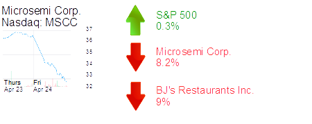 Aliso Viejo-based Microsemi Corp. was down 8.2% to $32.79 and a $3.1 billion market cap. The semiconductor maker reported net income of $25 million in its most recent quarter, compared with a loss in the same period last year, but revenue of $296.2 million missed analyst expectations of $296.9 million and revenue guidance of $302 million for the current quarter is below the midpoint of $304 million consensus.