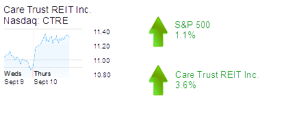 Mission Viejo-based Care Trust REIT Inc. was up 3.6% to $11.28 and a $519 million market cap. KeyBanc initiated coverage on the healthcare facility owner’s shares with an “overweight” rating and a price target of $13.