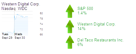 Irvine-based Western Digital Corp. was up 14% to $78.90 and an $18.3 billion market cap. The storage products maker said a China-based company would buy a 15% stake in the company for $3.8 billion.